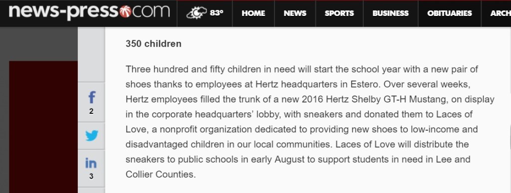 Over several weeks, Hertz employees filled the trunk of a new 2016 Hertz Shelby GT-H Mustang, on display in the corporate headquarters’ lobby, with 350 pairs of sneakers and donated them to Laces of Love, a nonprofit organization dedicated to providing new shoes to low-income and disadvantaged children in our local communities. Laces of Love will distribute the sneakers to public schools in early August to support students in need in Lee and Collier Counties.